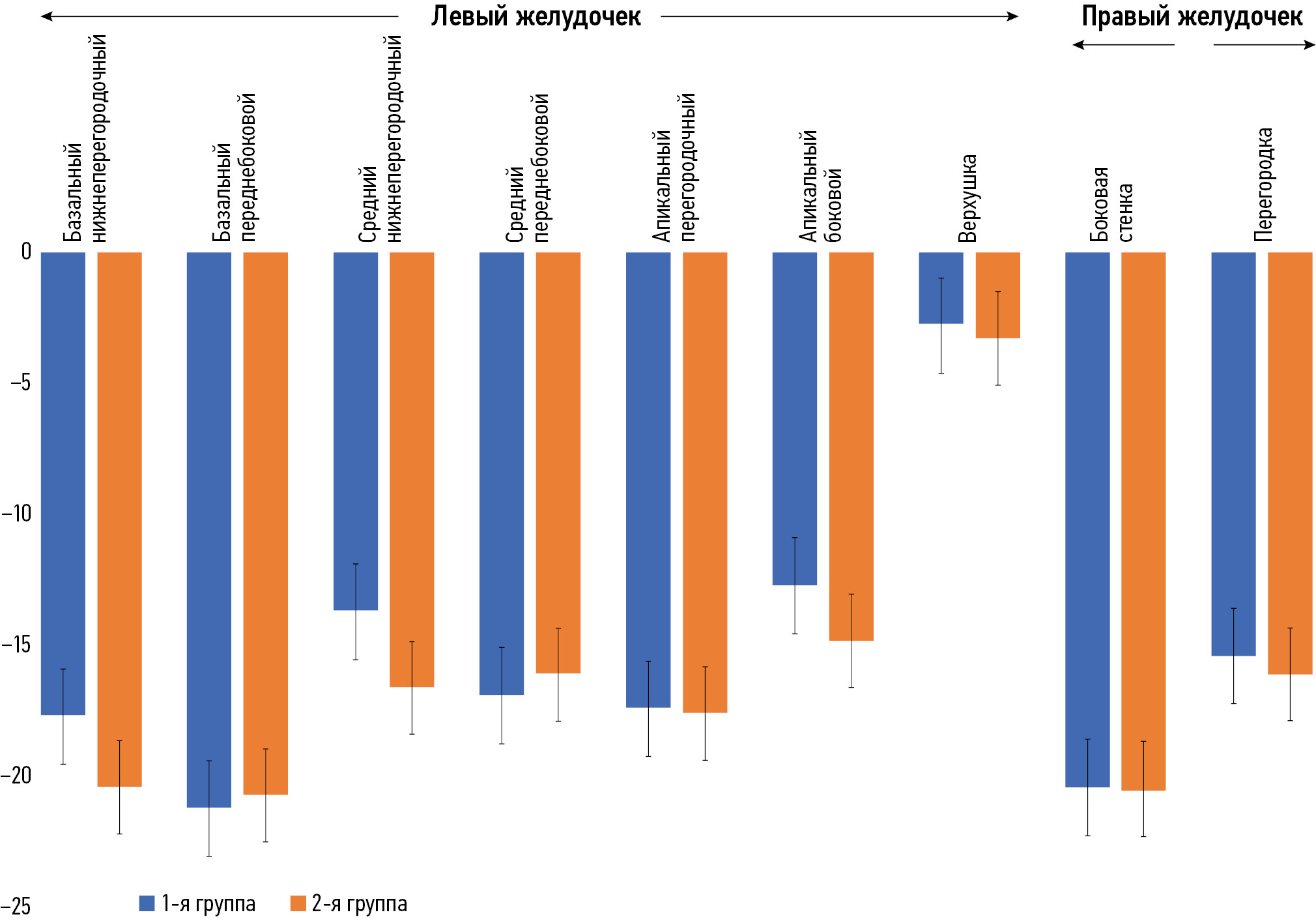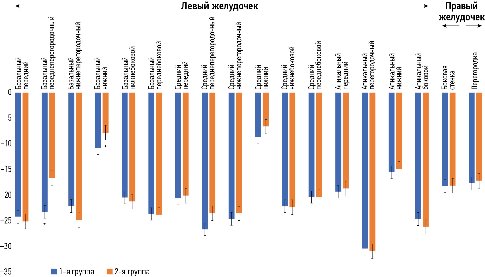 Feature-tracking (Strain)1 выполняли с использованием программного обеспечения Segment CMR® (Lund, Швеция). Для анализа выбирали базальные, средние и апикальные короткоосевые срезы левого желудочка (ЛЖ) и ПЖ, а также 4-камерный срез. С помощью инструмента перемотки определяли моменты конечной диастолы и конечной систолы, после чего вручную обводили контуры эндокарда и эпикарда. Пиковую глобальную циркулярную деформацию ЛЖ и ПЖ рассчитывали как средневзвешенное значение (по количеству сегментов) пиковой циркулярной деформации базального, среднего и апикального отделов. Для оценки продольной деформации ЛЖ контуры эндокарда и эпикарда дополнительно строили на 2- и 4-камерных проекциях. Пиковую глобальную продольную деформацию ЛЖ и ПЖ определяли по 4-камерной проекции. Результаты экспортированы в документ Word, где записаны пиковые значения глобальной циркулярной и продольной деформации.