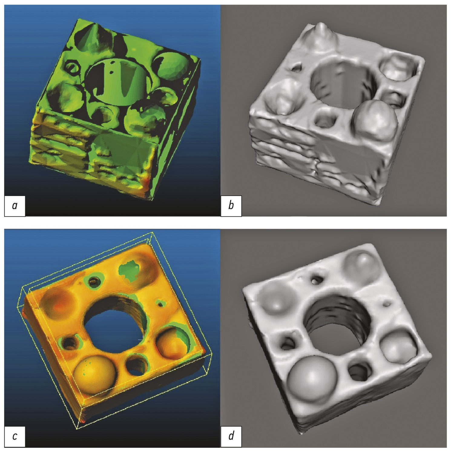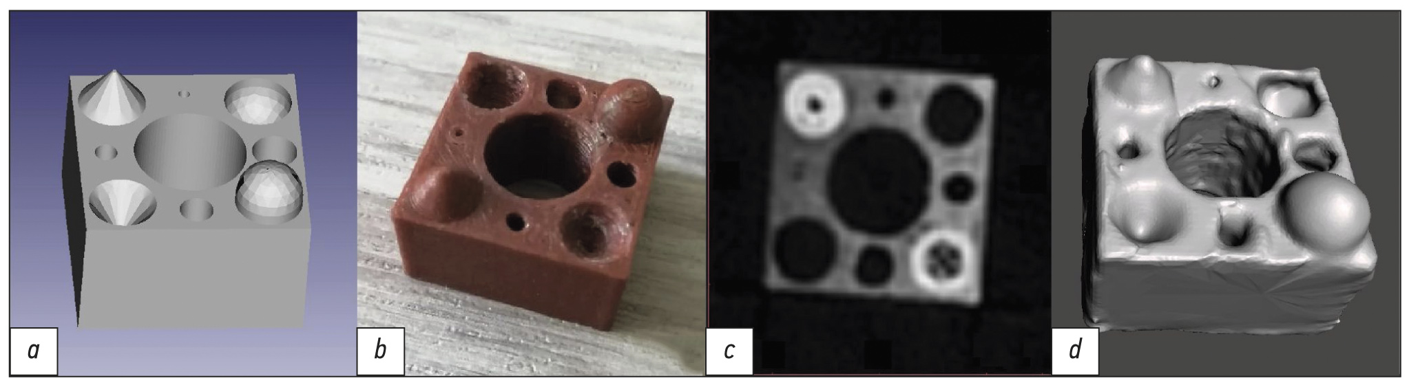 3. Fig. 2. Appearance of the model of reference 1 after the stages: a - parametric modeling; b - 3D printing; c - CT scan (axial slice, window level +805 HU, window width 3718 HU, higher density of protrusions due to closer filament placement in the horizontal plane); d - Creates a polygon mesh based on CT data.
