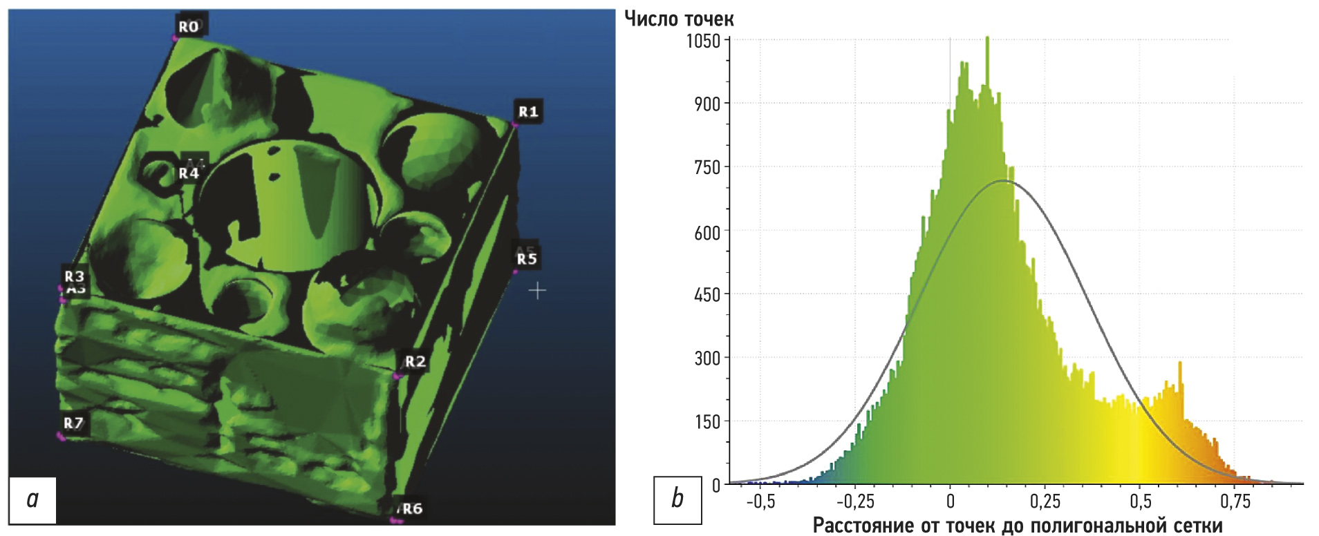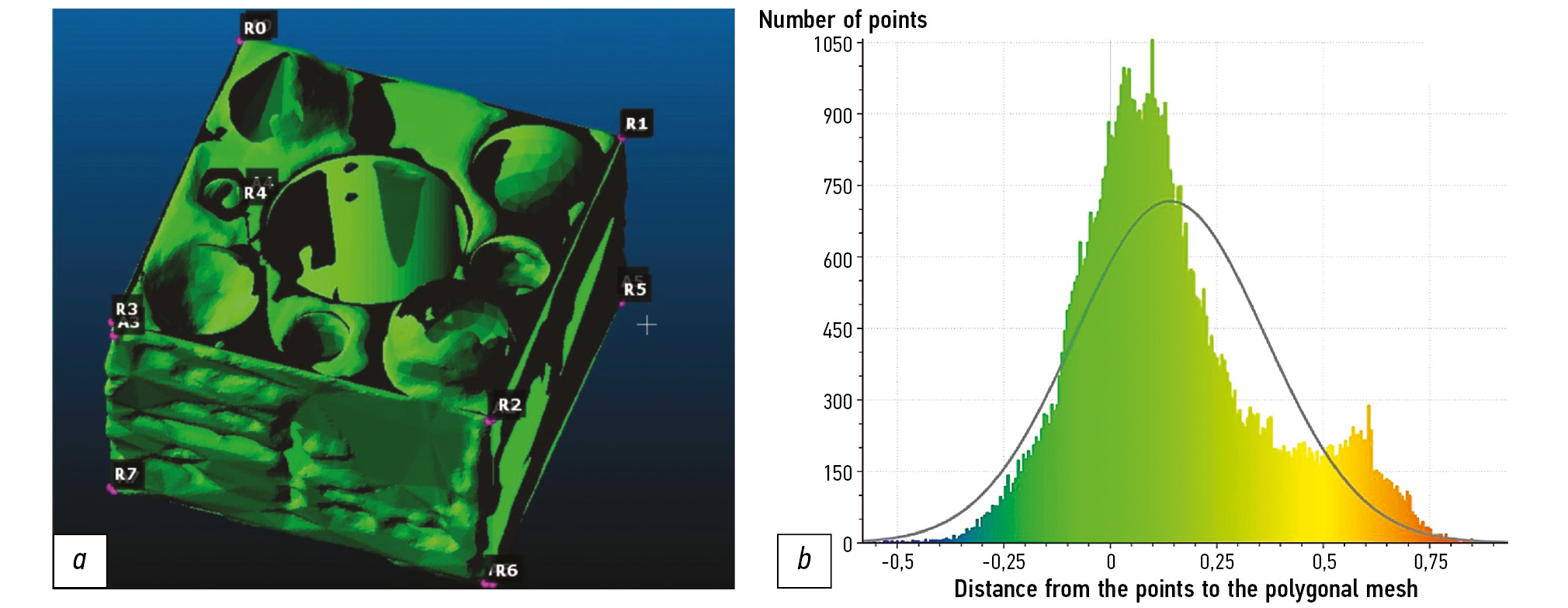 4. Fig. 3. Alignment of polygonal meshes of models (a) and a histogram of the calculated deviations of linear dimensions (b).