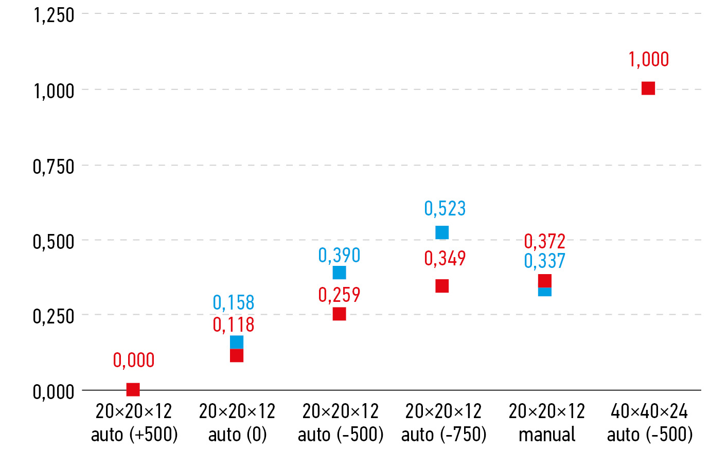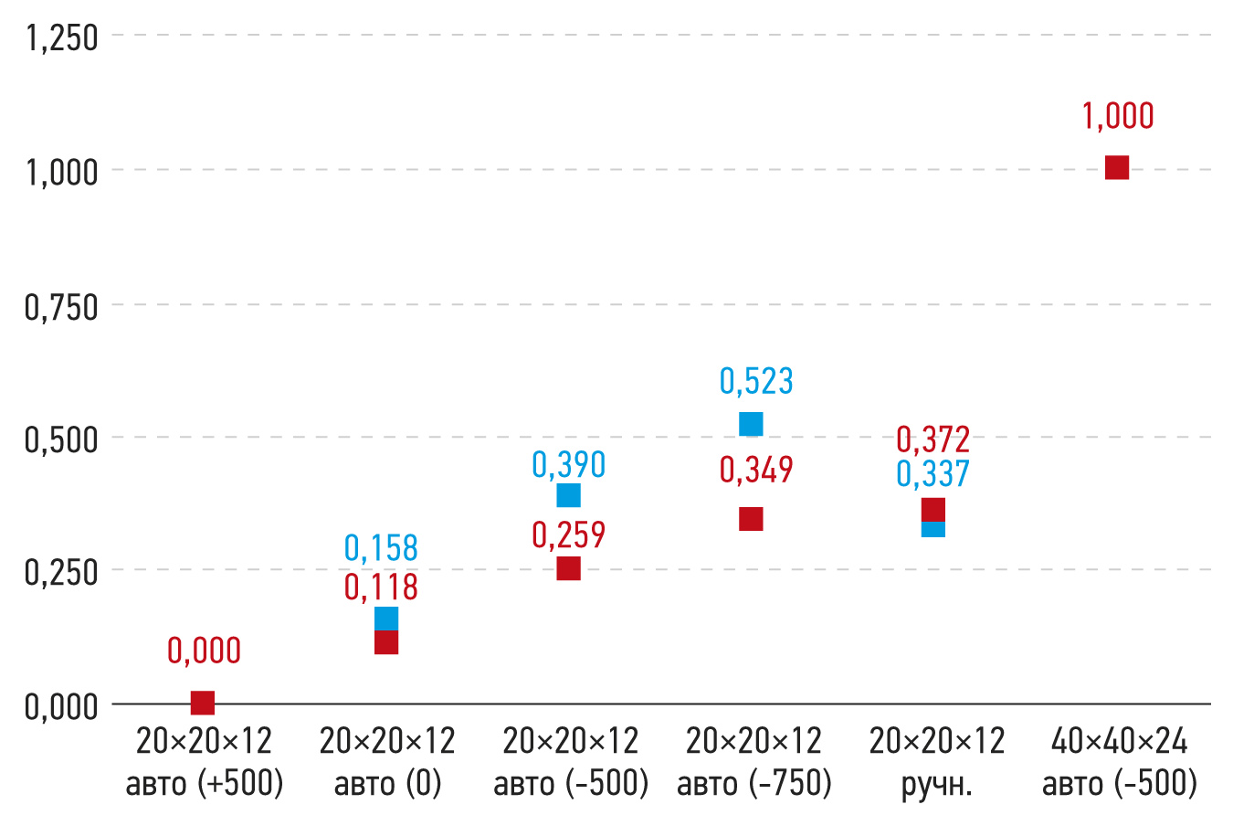 6. Fig. 4. Linear normalized values. Red color: differences in the volume of models with the reference; blue color: differences in the integral sum of linear deviations.