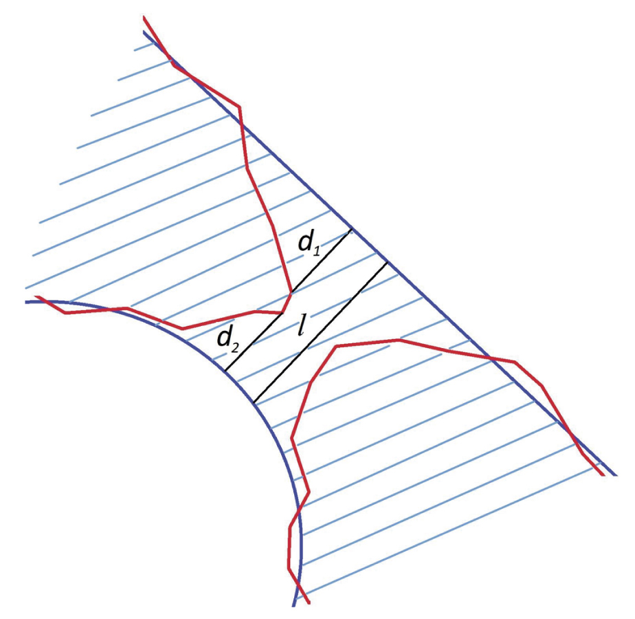 Thus, the linear displacement summation of the vertex relative to the outer surface (d1 segment) with the nearby vertex displacement relative to the inner surface (d2 segment) may correspond to a wall defect of l thickness exceeding the maximum linear deviation value. Similarly, the positive deviation summation leads to the “obliteration” of holes that exceed the maximum size deviation calculated from the ICP algorithm results. Thus, the linear dimensions of the reproduced models include two values of linear displacement.