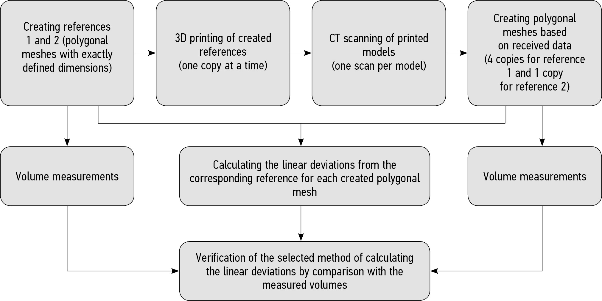 This study aimed to assess the geometric deviations that occurred when reproducing objects imitating bone tissues using 3D modeling (based on computed tomography [CT] data) and additive manufacturing.