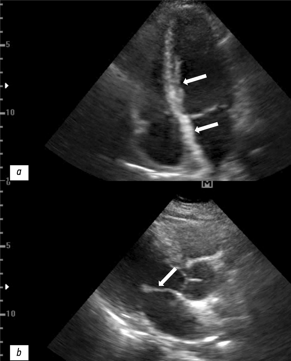 Рис. 2. Результаты эхокардиография пациентки: a — утолщение межжелудочковой и межпредсердной перегородки (белые стрелки); b — утолщение передней створки митрального клапана (белая стрелка).