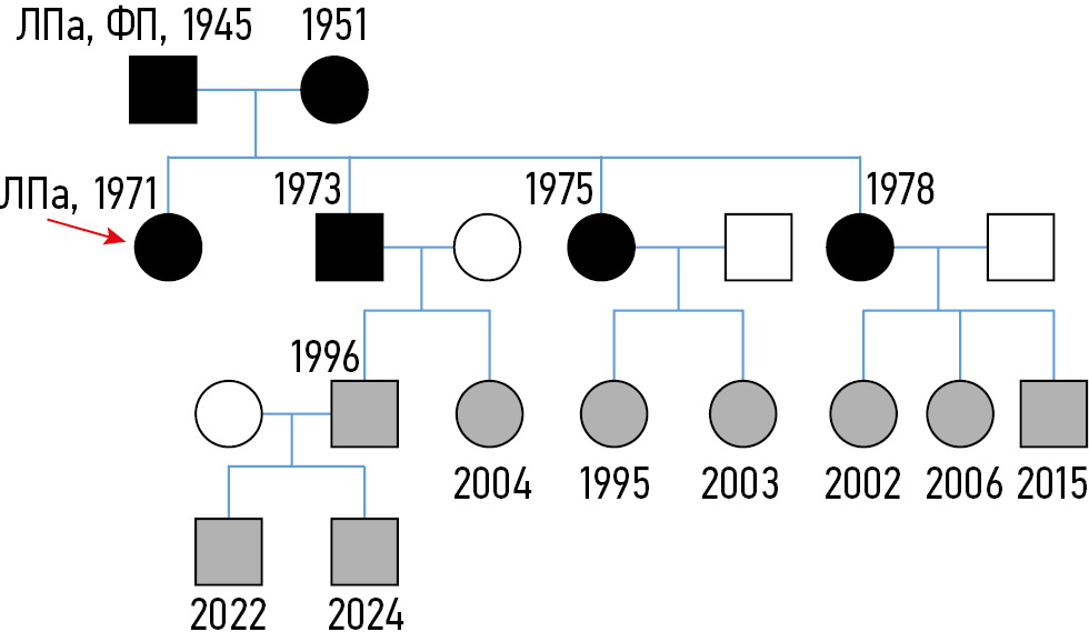 Рис. 3. Родословная пациентки с семейным транстиретиновым амилоидозом. Кружком обозначены женщины, квадратом — мужчины. Чёрным цветом показаны члены семьи с выявленной мутацией, белым — без выявленной мутации, серым — необследованные (обследование запланировано). Цифрами указан год рождения. ФП — фибрилляция предсердий в анамнезе у отца; ЛПа — повышение концентрации липопротеина (а), в частности у пациентки и её отца (у остальных членов семьи анализ на определение его содержания не проводили по техническим причинам).