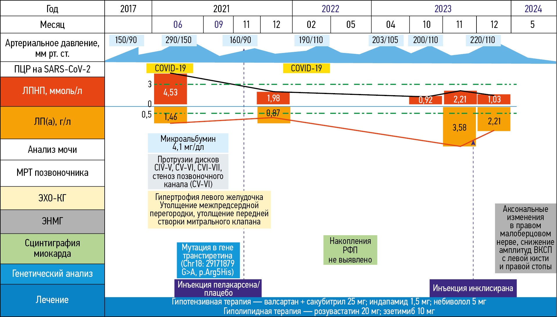 Пациентке назначена трёхкомпонентная гипотензивная терапия и высокоинтенсивная терапия статином в комбинации с эзетимибом с достижением целевых значений АД и холестерина ЛПНП. С целью таргетной терапии гиперлипопротеин(а)емии ей предложено участие в клиническом рандомизированном двойном слепом плацебо-контролируемом многоцентровом исследовании (TQJ230). Тем не менее исследуемый препарат пелакарсен1 отменён в связи с аллергической реакцией в месте инъекции. Назначен инклисиран.