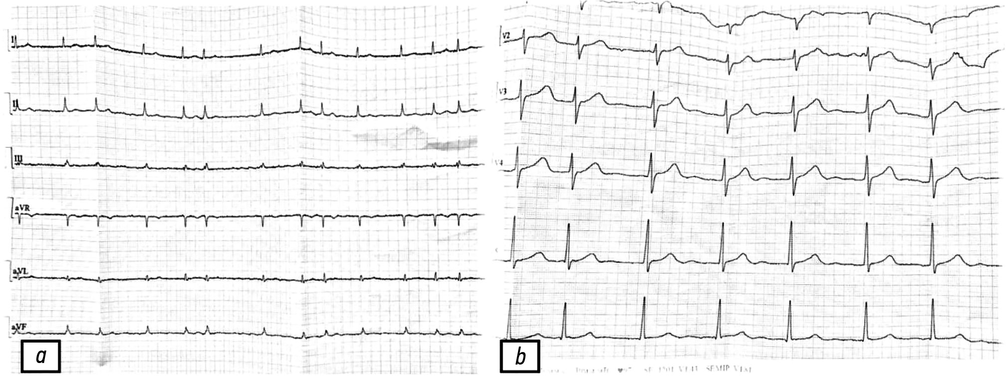 Рис. 5. Электрокардиограмма в 12 отведениях отца пациентки: a — скорость записи в стандартных и усиленных отведениях от конечностей 25 мм/с; b — скорость записи в отведениях с поверхности грудной клетки 50 мм/с. Стандартное напряжение на входе 1 мВ, что соответствует отклонению в 10 мм.