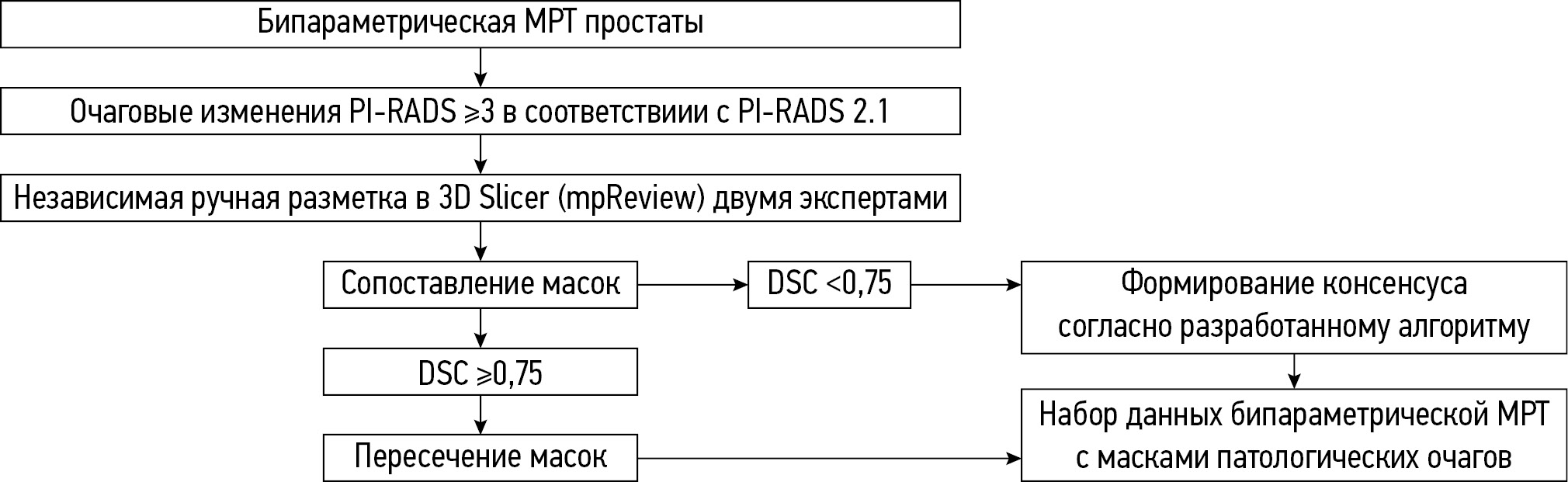 Поскольку в мировой литературе не представлено общепринятых граничных значений DSC при консенсусной разметке [12], мы решили установить пограничное значение, равное 0,75. В случае, если DSC ≥0,75, то площадь пересечения двух масок сохраняли как итоговую. Если DSC <0,75, то такие очаги простаты подлежали повторному пересмотру совместно двумя экспертами с целью достижения консенсуса.