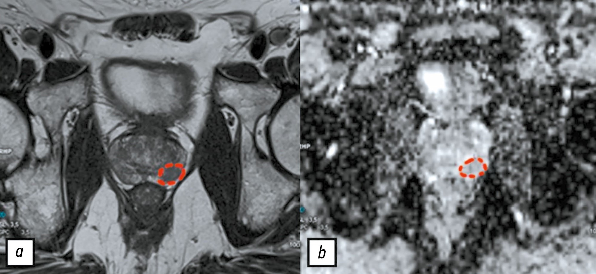 Рис. 2. Референсные изображения со схематически отмеченным очагом в периферической зоне левой доли простаты: a —Т2-взвешенное изображение; b — карта исчисляемого коэффициента диффузии.