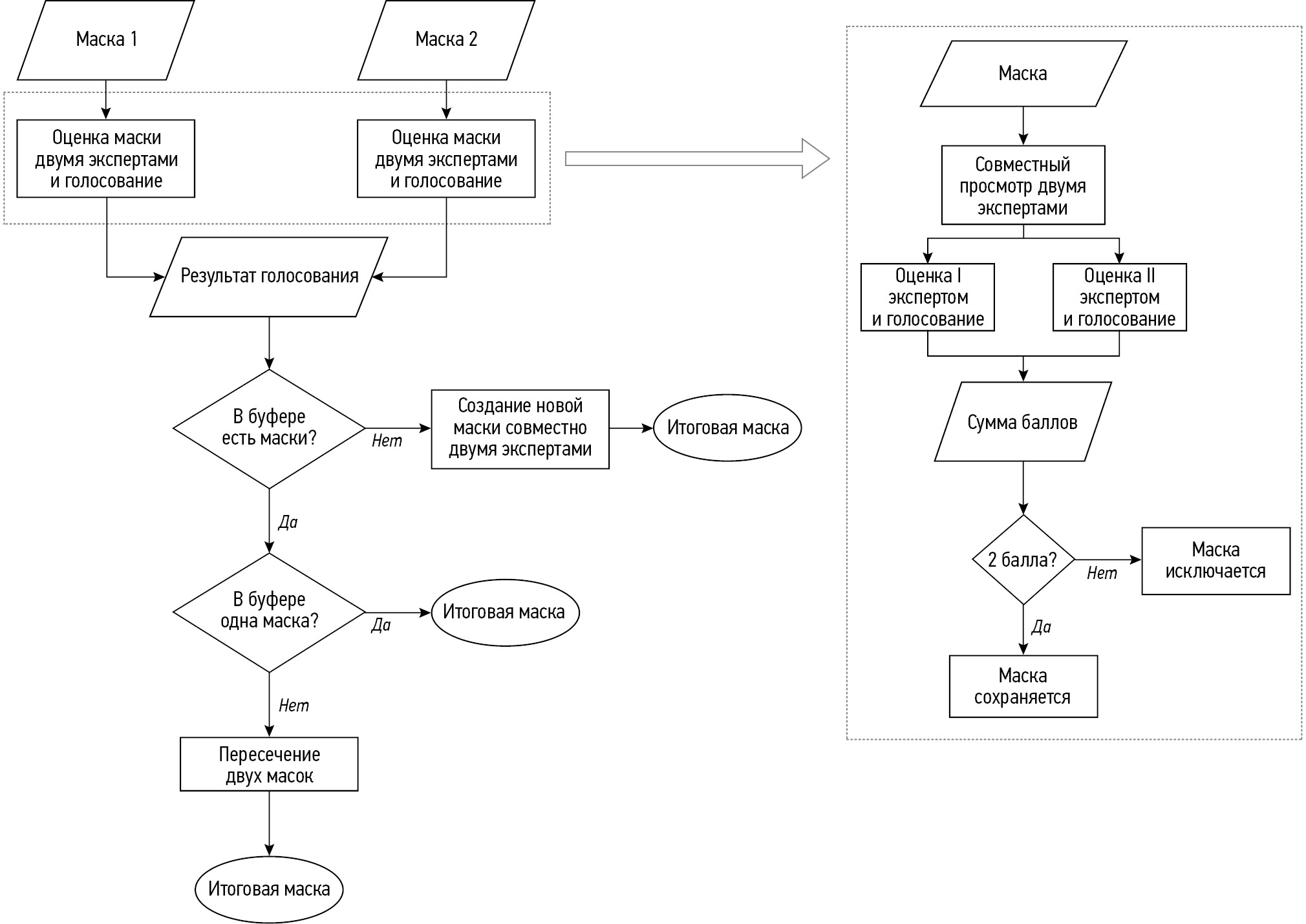 - в-третьих, мы не смогли полностью избежать этапа свободного обсуждения в одном из сценариев алгоритма, когда эксперты отвергают обе маски. Возможным вариантом решения данной проблемы, при наличии временных ресурсов, может стать повторное прохождение алгоритма для подобных очагов.