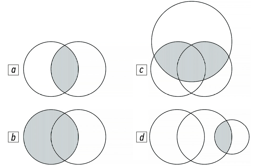 Рис. 4. Расчёт коэффициент сходства Сёренсена–Дайса после прохождения алгоритма: а — если эксперты выбрали обе маски (сохраняется первичный коэффициент сходства Сёренсена–Дайса); b — если выбрана одна из двух масок; c — новая маска имеет пересечение с двумя предыдущими; d — новая маска пересекается только с одной из предыдущих масок.