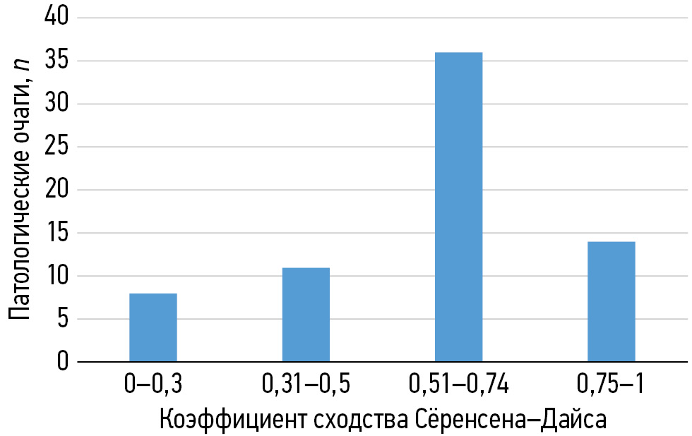 Количество очагов, для которых DSC ≥0,75, составило 14 (20,2%). Маски остальных очагов (n=55, 79,8%) подлежали повторному пересмотру в соответствии с алгоритмом. Ранжирование по категории паологических очагов в группе пересмотра: