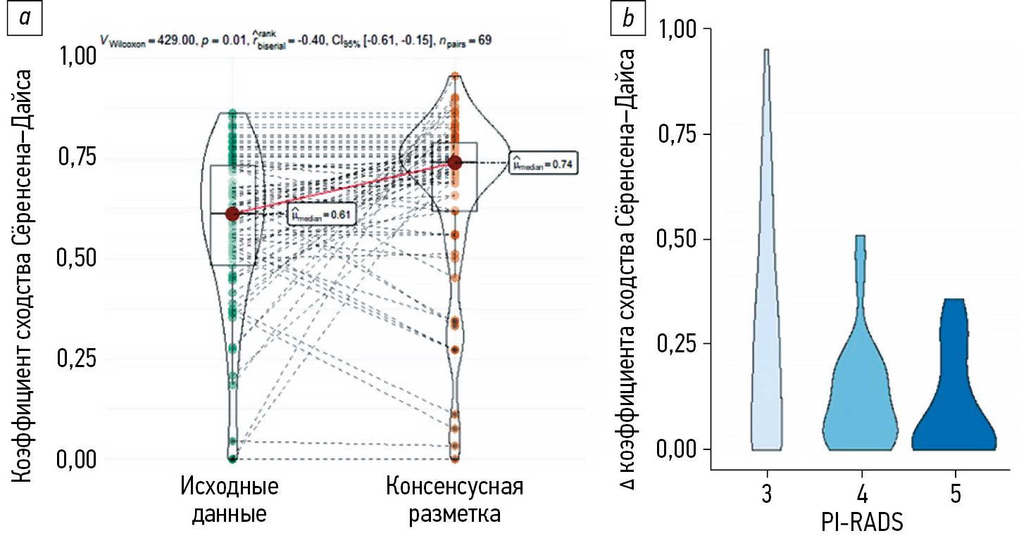 Рис. 6. Сопоставление значений коэффициента сходства Сёренсена–Дайса до и после применения алгоритма консенсусной разметки: a — сравнение медиан; b — связь с категорией PI-RADS. PI-RADS (Prostate Imaging-Reporting and Data System) — система визуализации, описания и оценки изображений простаты.