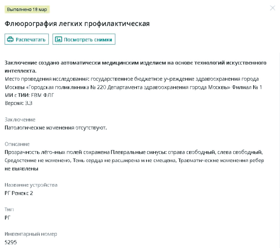 - результаты работы ИИ-сервиса в виде электронной медицинской записи сохраняли в электронной карте пациента в ЕМИАС;