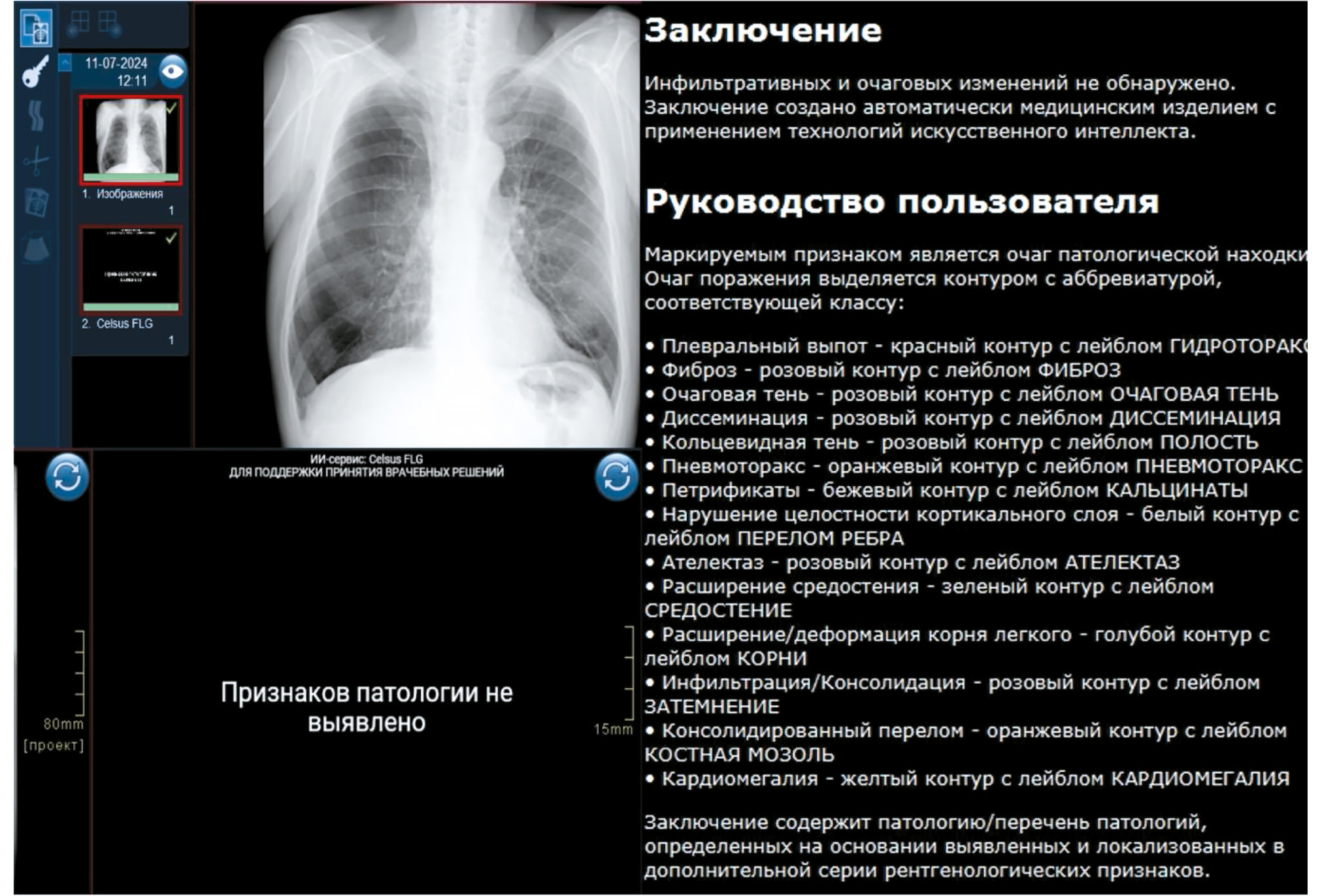 - При наличии признаков патологических изменений (категория «не норма») результаты лучевого исследования автоматически маршрутизировали для описания врачом-рентгенологом НПКЦ ДиТ ДЗМ. Протокол и заключение, подписанные врачом-рентгенологом, сохраняли в электронной карте пациента в ЕМИАС.
