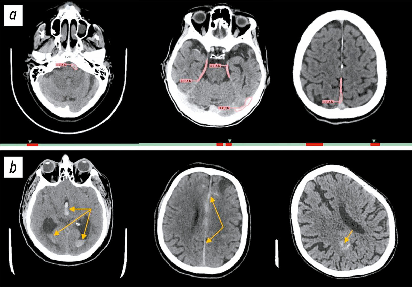 Внутричерепное кровоизлияние (ВЧК) — потенциально опасное для жизни острое состояние, связанное с экстравазацией крови в ткани головного мозга, которое может возникнуть либо спонтанно, либо в случае травмы головы или хирургического вмешательства. Частота случаев ВЧК составляет более 25 на 100 тыс. человеко-лет по данным мировой статистики [1]. В Российской Федерации (РФ) ежегодно диагностируют геморрагический инсульт у 43 тыс. пациентов, он составляет от 10 до 15% общего числа случаев острых нарушений мозгового кровообращения [2]. Этиология нетравматического ВЧК разнообразна и включает артериальную гипертензию, инсульт, разрыв аневризмы, васкулопатию, тромбоз венозного синуса, артериовенозную фистулу, злокачественные новообразования, применение антикоагулянтов и реже — воспалительные заболевания [1]. ВЧК связано с высоким риском смерти (до 40–50% случаев) в первые сутки и инвалидизацией выживших пациентов [1, 2]. Обычно среди ВЧК различают эпидуральную, субдуральную, субарахноидальную и паренхиматозную (внутримозговую) локализации. Их дифференцируют с учётом клинической картины, особенностей визуализации и прогноза [2]. Компьютерная томография головного мозга (КТ ГМ) — основной диагностический инструмент, который применяют для обследования пациентов, поступающих в отделения неотложной помощи с головной болью или очаговыми неврологическими нарушениями [2]. Это относительно доступный и быстрый метод, результаты которого позволяют оценить тяжесть патологического процесса и определить тактику лечения [3]. Важно отметить, что диагностика ВЧК в первые 24 часа имеет решающее клиническое значение для снижения ранней смертности. Это достигают за счёт оценки вовлечённых областей мозга, объёма кровоизлияния, наличия высокорисковых признаков визуализации (симптомы «вихря», «пятна»), а также учёта клинического контекста, что позволяет своевременно определить тактику ведения пациента и организовать последующее наблюдение [4, 5].