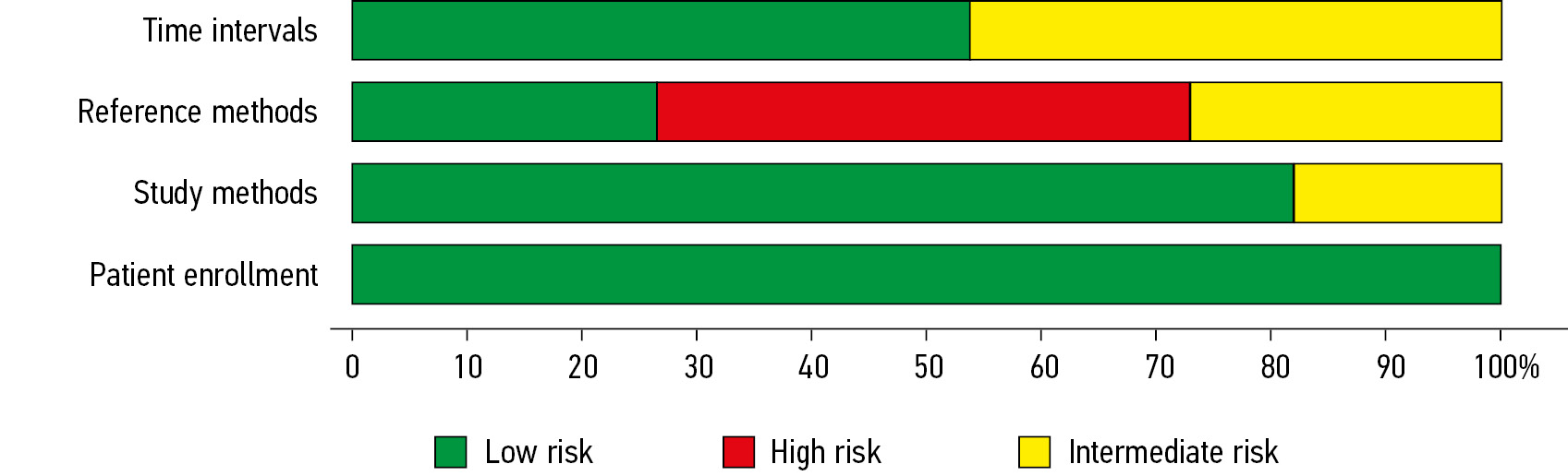 Risk of bias: The QUADAS-2 (Quality Assessment of Diagnostic Accuracy Studies) questionnaire was used to assess the risk of bias in individual studies [15]. The texts of articles were assessed according to the following criteria: patient enrollment, studied methods, reference methods, and time intervals between the study and reference methods. Certain questions from the QUADAS-2 checklist were not employed due to lack of necessity (for example, in the papers assessing the ADC, no question related to the study interpreter’s blinding was used, since the ADC is an objective assessment). Finally, a histogram was generated after analyzing each study for the risk of bias.