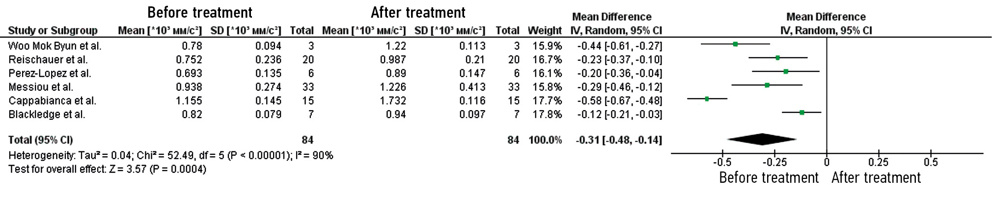 RESULTS: We selected and analyzed 11 out of 312 sources found as a result of the search. It allowed us to identify four groups of objective MRI criteria for evaluating the therapeutic effect in metastatic bone lesions in patients with prostate and breast cancer, including the dynamics of sizes, signal intensity on DWI, ADC, and tumor total diffusion volume (tDV). Changes in these quantitative and semi-quantitative indicators, with only one exception, had the same direction, although they differed in numerical values. A random-effects model was used for analysis considering the presence of statistically significant heterogeneity (p <0,1 for χ2 test; I2 >40%),. The change in ADC as a result of treatment averaged +0.35 [+0.12; +0.49] ×10−3 mm2/s, with average values of ADC before treatment ― 0.83 [0.71; 1.03] ×10−3 mm2/s, after treatment ― 1.18 [0.83; 1.49] ×10−3 mm2/s.