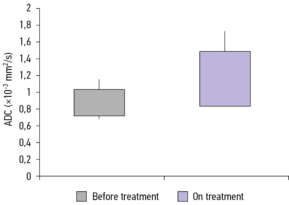 The dynamics of DWI signal intensity could be regarded as an objective criterion for response assessment [5, 16, 20]. The authors of all papers observed a decreased intensity of signal lesion in patients who responded to systemic therapy. However, given that numerical values are presented only in one work [20], and the nature of lesions and type of systemic therapy were not considered in all three papers, further study of the DWI signal intensity change dependence on the aforementioned conditions is necessary.