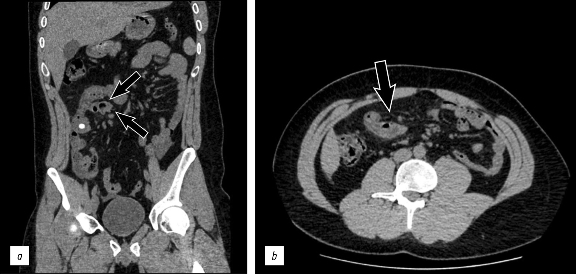 Fig. 1. This coronal (a) and axial (b) pre-contrast computed tomography images showing a blind-ended intestinal loop (arrows) in the right quadrants of the abdomen with associated mesenteric edema and multiple contiguous lymphadenopathies.