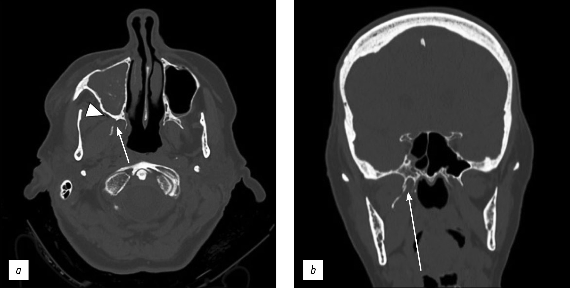 The patient was referred to the radiology department for noncontrast-enhanced high-resolution computed tomography (CT) on a 64-slice scanner, which showed unilateral right pterygoid plate fracture with signs of emphysema in the ipsilateral masticatory space (Fig. 1a, 1b). The CT investigation also documented the fracture of the medial wall of the right maxillary sinus with hemosine (Fig. 2a, 2b, 2c).