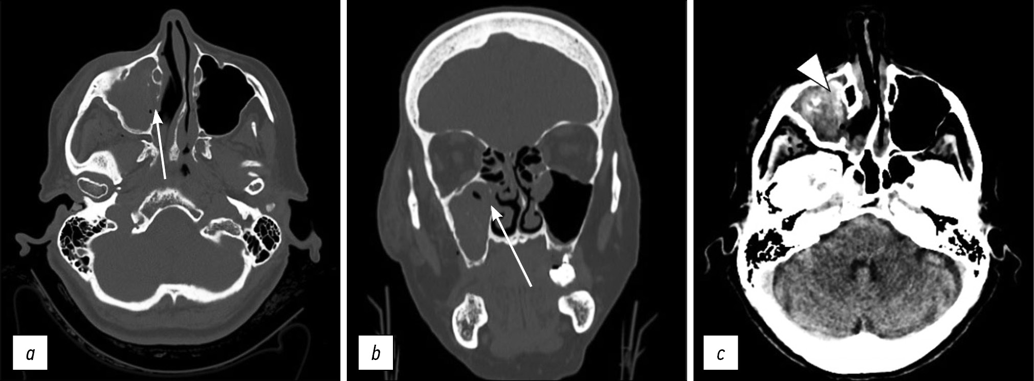Fig 2: Axial (a) and coronal (b) CT scan with bone window documents the fracture of the medial wall of the right maxillary sinus (arrows). Soft window (c) shows hemosine in the right maxillary sinus (arrowhead).