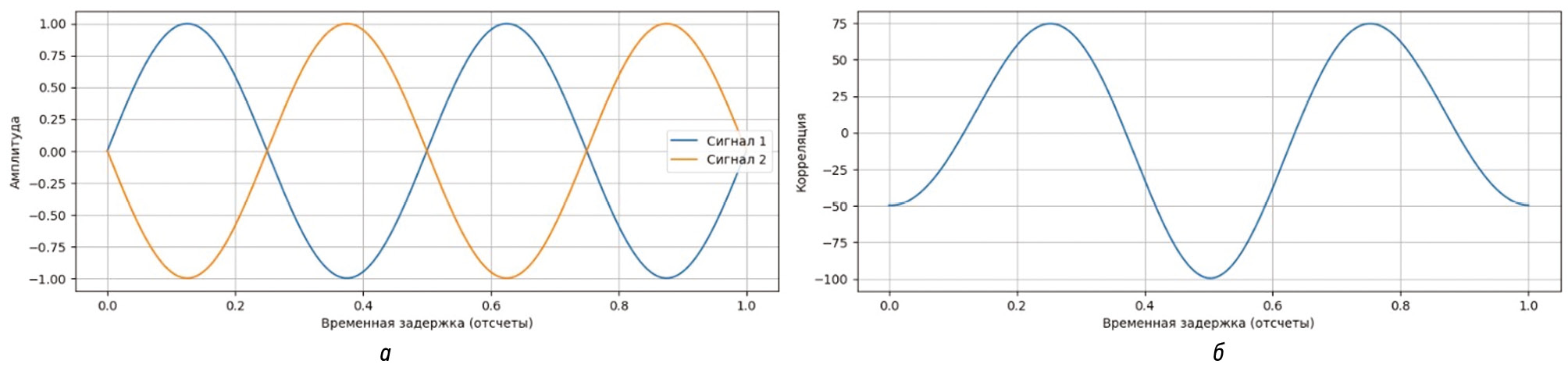 Рис. 1. а) Синусоидальные сигналы; б) График корреляции сигналов