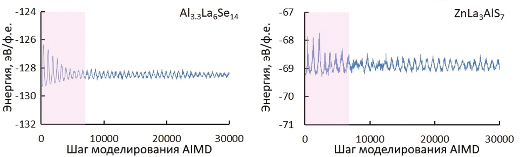 Результаты. Во всех нитритах реализуется трехмерная карта миграции рабочих катионов с Em < 1эВ, что говорит о вероятной подвижности ионов Me в структурах. Нитриты лития и цезия обладают самой низкой Em среди всех рассмотренных нитритов — 0,51 эВ. Все полученные расчетные данные показаны в таблице 1. Методами AIMD (рис. 1) выявлено девять перспективных ионных проводников с высоковалентными рабочими ионами Zn2+ и Al3+ со структурным типом La3CuSiS7, для которых значения проводимости достигают 10–2 См/см.