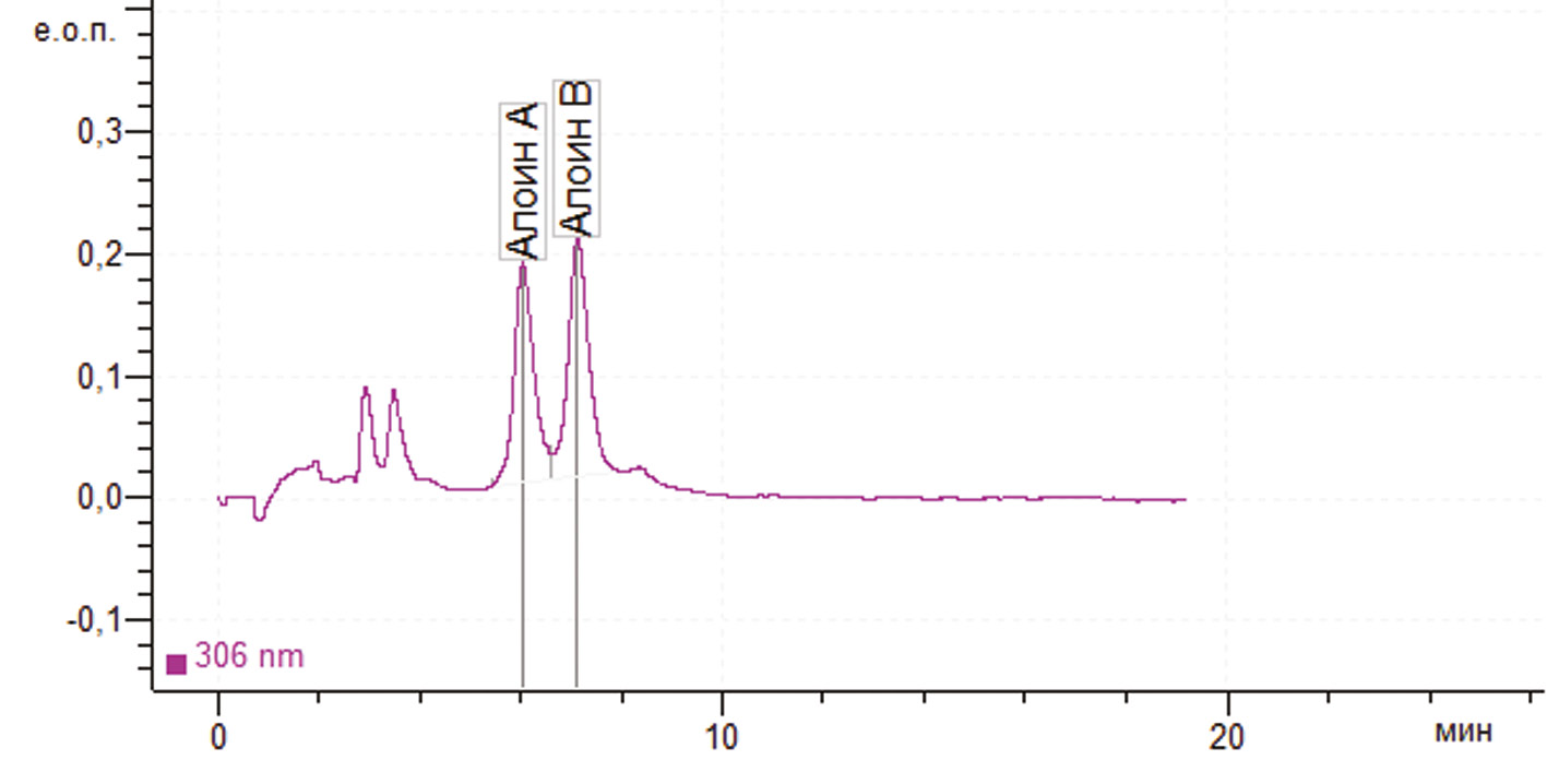 Фракции собирали объемами по 50–100 мл, анализировали методом тонкослойной хроматографии (ТСХ) в системе хлороформ : 95 ٪ этиловый спирт : вода 25 : 17 : 2 (об./об./об.). Детекцию проводили в видимой области спектра и при облучении УФ-светом (254 и 365 нм). На хроматограмме при облучении УФ-светом барбалоин обнаруживается в виде пятна оранжевого цвета со значением Rf около 0,6.