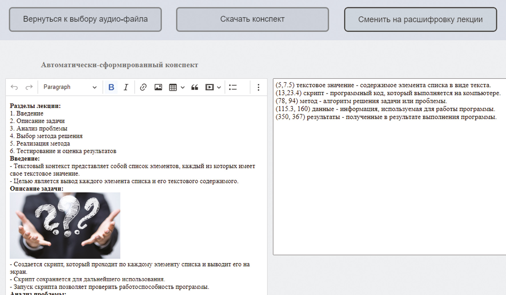 Функциональности первого модуля позволяют преобразовывать аудио в текст, с соблюдением орфографии и пунктуации, а также с распознаванием англицизмов, часто употребляемых в профессиональной речи. Это достигается возможностями модели Whisper v.3, не требующей для работы графических ускорителей. После получения текста аудио используется связка моделей LangChain Retrievers и большой языковой модели Saiga-2. В результате их последовательной работы формируется краткий конспект и выделяются термины с временными метками, указывающими на употребление данных терминов в аудио. В конспекте выделяется оглавление, терминам в глоссарии сопоставляются определения, а также средствами библиотеки BeutifulSoup в некоторые разделы конспекта подбираются и вставляются картинки из открытых источников (рис. 1).
